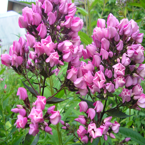 - Необычная форма: У этого сорта флокса наблюдается эффектная форма куста с густыми, плотными цветками, которые образуют красивую метёлку в период цветения. Его цветение начинается в начале лета и продолжает радовать глаз до осени.