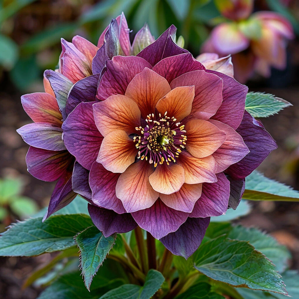 - Уникальная окраска: главная особенность этого сорта — его яркая и необычная окраска, словно отражающая пламя костра. Цветки морозника Претти Элен Рэд имеют насыщенный оранжевый цвет, который у краев лепестков переходит в легкий фиолетовый оттенок, создавая эффект мерцания и глубины. Такая палитра делает каждый цветок неповторимым и притягивающим взгляды.